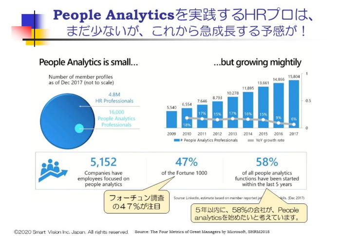 今年は、JSHRM月例会として、9月30日(月)に日本生産性本部にて、SHRM2019コン ファレンス 視察報告会を予定しております。 従来のSHRM人材マネジメント年次総会ですと、離職率の改善、職場への定着、ブランドイ メージの改善、人材開発、キャリア支援等が主要テーマでしたが、最近のコンファレンスで は、魅力的なベネフィットや職場環境、飛躍的成長支援、異文化の優秀人材にも魅力的な企 業になるための支援等のテーマが増えました。 特に、People analyticsを活用して、従業員や有望顧客の行動形態を分析して、人財採用、 ブランディングの強化に役立てる事例も増えています。 国内のIT人材だけでは、競争力を維持できないので、インドや中国、東南アジアの優秀人財に