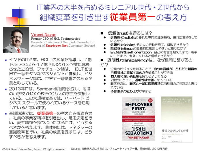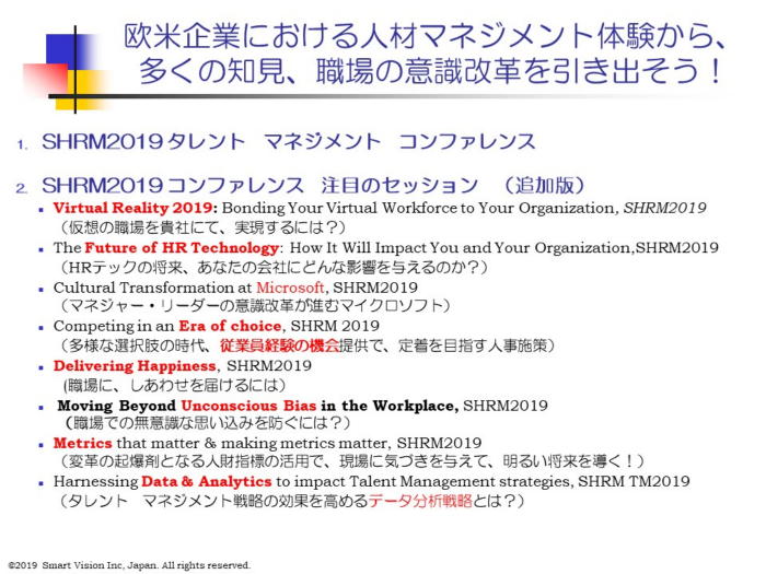 そうな事例を取り上げ、参加者のご希望の強い事例を中心に解説させて頂きたいと思いますが、 他に興味ある分野があれば、SHRM e-learning libraryの情報から、最新情報を入手して、お 知らせしたいと思います。 ご意見を遠慮なくお聞かせください。 通常、9月上旬頃には、SHRM e-learning libraryに、SHRM2019コンファレンス関連のセッ ションが掲載されます。 特に、IT分野では、今後のグローバル人材マネジメントの動向に遅れをきたすと、成功の軌道 に乗ることは難しくなりますので、是非、参考にして頂きたいと思います。 多くの方の参加をお待ちしております。