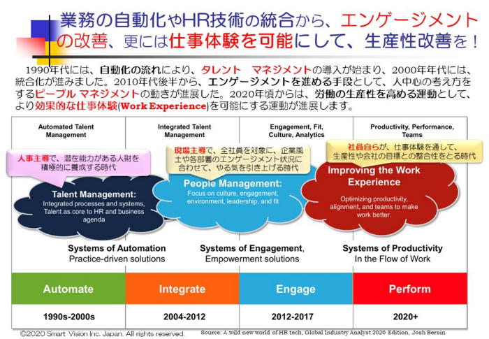 体験(EX)をHRテックで実現するには!」と題して、紹介記事を掲載しています。 この記事にて、HRテックの現実と将来の可能性の一端を紹介する予定ですが、この中身を もう少しジックリと知りたい方、具体的にどう進めたら良いのか質問がある方、他のJSHRM会 員の方の意見も、参考までに、聞いてみたいと考えている方のために、今回の機会をつくりまし た。 ここ数年のHRテック関連情報を収集すると、何と200枚ほどスライドになりました。 この内容を要約して、記事にしたものですが、あまりの多くの情報が含まれているため、 ご紹介できなかったものが沢山あります。 その中には、Josh BersinによるHRテック予測情報、SHRM2017-2019コンファレン