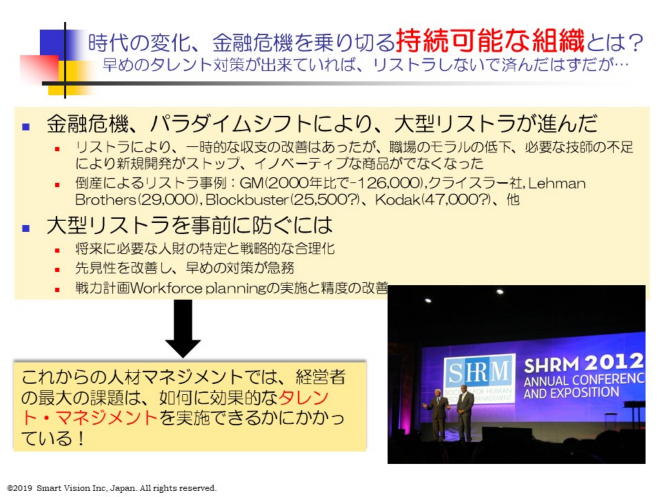 当時の連邦政府は、何が最大の原因だったのか、大型リストラを事前に防ぎ、持続可能な組織を目指にはどうすべきなのか、人材マネジメント関連の最大のネットワーク組織の人材マネジメント協会SHRMに報告する様に命じた。 その中で、確かに、革新的な商品が出てくることが必要ではありますが、それ以前に重要な点は、優秀な人材にも魅力を感じる職場環境を整備すると同時に、将来必要な戦力を特定し、戦略的に配置、育てる戦略的施策としての戦力計画を進めることが最大の課題だと考えた。 今後の経営者の評価は、好きなことを自由にやらせて、革新的な商品を送り出したかより、むしろ「将来あるべき姿に、どれだけ近づけたか」どうかで判断すべきものだ。 これを支援するため、SHRMが中心となり、HRプロフェッショナルを育てるプロジェクトを開始することを宣言し、色々と不満の多かった従来のパフォーマンス マネジメントの仕組みを見直し、Workforce planning(戦力計画)等の標準化の旗振りをすると発表した。 この計画に基づき、知識ベースに偏りがちであった、従来のHRプロ認定を、SHRM自らが推進することにし、SHRMコンピテンシーを発表した。 このSHRMコンピテンシーをベースにした SHRM HRプロ認定を2015年から開始したことで、当センターでも、2015年12月から、JSHRM 自主運営研究会として、SHRMコンピテンシー研究会を立ち上げた。 |