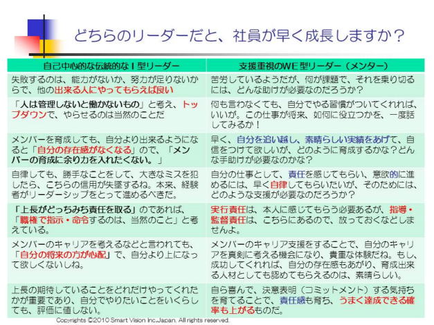 問題は、果たしてこれで、メンバーは、成長したことになるのでしょうか? 上長であるリーダーが不在の時や、異動した時に、パニックが到来します。自分でどのように考え、進めるべきかのノウハウをキチンと学んでないことに気づくのです。カリスマ創業者がいる場合は、このような状況になりがちです。例えば、国土計画、西武鉄道の堤義明氏やダイエーの創業者、中内功氏は、その良い事例です。また、一般的な中間管理職にも似たような考え方の人は多くいます。 支援重視のWE型リーダーの典型は、欧米では、メンター(Mentor)と呼ばれます。成功する人がいれば、その背後に必ずメンターありと言われるほど、影で支える大変重要な存在になっています。 皆さんは、どちらのタイプを目指してますか? 現在の上長は、どちらのタイプですか?